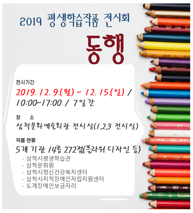 (정도일보) 삼척시는 ‘ 2019 평생학습 작품 전시회 ‘동행’ ’을 삼척문화예술회관에서 개최한다.