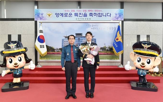 [강원=안준희 기자] 강원지방경찰청(청장 김재규)에서는 지난 13일 청사 1층 포토존에서 각 과, 계장 및 직원들이 참석한 가운데 강원지방경찰청 사이버수사대 김두호 경위의 특별승진 임용식을 진행했다.