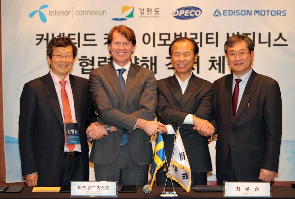 (정도일보) 강원도는 ㈜디피코, 에디슨모터스와 함께 세계 최대 모바일 네트워크 사업자 중 하나인 텔레노어 커넥션과 “강원도 전기자동차 산업의 글로벌 진출을 위한 업무협약”를 체결했다고 지난 17일 밝혔다.