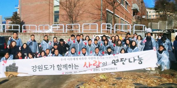 보건복지여성국은 직원들의 자발적 모금을 통해 춘천연탄은행에 130만원을 기탁였으며 보건복지여성국장을 비롯한 직원 60여명이 참여한 가운데 독거노인 등 형편이 어려운 소외계층의 집으로 지게를 짊어지고 직접 연탄 1,300장을 배달해 이웃사랑을 실천하는 뜻깊은 시간을 가졌다 강원도 보건복지여성국장은 “이번 연탄나눔이 추운 겨울 어렵게 생활하시는 이웃들에게 조금이나마 힘이 되길 바란다”며 “앞으로도 우리 주위에 도움을 필요로 하는 이웃들을 늘 돌아보고 지속적으로 봉사활동을 펼쳐나갈 계획이라고 전했다”고 밝혔다.