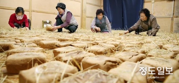 [전남=윤진성 기자]영하로 떨어진 아침 기온과 달리 포근한 날씨를 보인 성탄절인 지난 25일 전남 강진군 군동면 전통된장마을에서는 만들어진 메주가 발효실에서 숙성이 잘 되도록 뒤집어주고 건조대에 걸어둔 메주가 제대로 말라가는지 살피는 동네 할머니들의 정성이 이어지고 있다.
