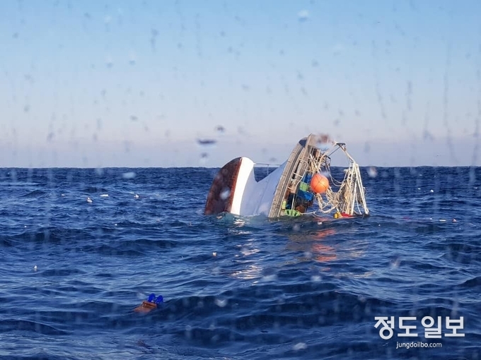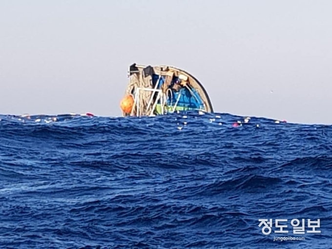 16시 30분 현재, A호는 선수 일부만 남겨놓고 전복되어 해상에 표류중인 상태이다.