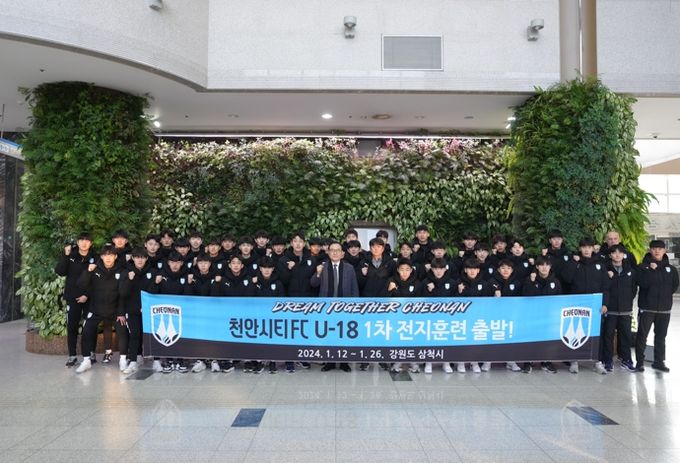 천안시티FC 구단주인 박상돈 천안시장은 12일 천안시청에서 1차 동계 전지훈련을 떠나는 천안시티FC 18세 이하 유소년팀을 환송했다.
