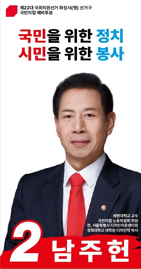[정도일보 김현섭 기자] 남주헌 예비후보(국민의 힘, 화성시 병)는 22년간 화성(동탄에서만 17년째 거주)에서 살고 있는 교육가(세명대학교 산업디자인과 교수)이자 도시디자인 전문가(전 서울시 디자인지원센터 센터장)이며, 이회창 전 국무총리에게 20대 시절부터 정치를 배워온 정치가이다. 그래서인지 정직과 신용, 헌신과 봉사를 30여년간 실천하고 있는 실천가이다. 그의 좌우명이 정학봉행(正學奉行)이다. 정학봉행이란 바른 자세에서 올바르게 학습하고 공존과 공영을 위해 봉사를 실천하는 것이다. 한참 선거 운동 중인 그를 24일 만났다.