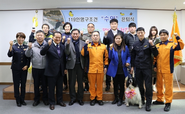 [경기=김현섭 기자] 경기도북부소방재난본부(본부장 이상규)는 지난 24일 119구조견 ‘수안’의 명예로운 은퇴행사를 남양주소방서에서 새로운 가족들과 함께 진행했다.