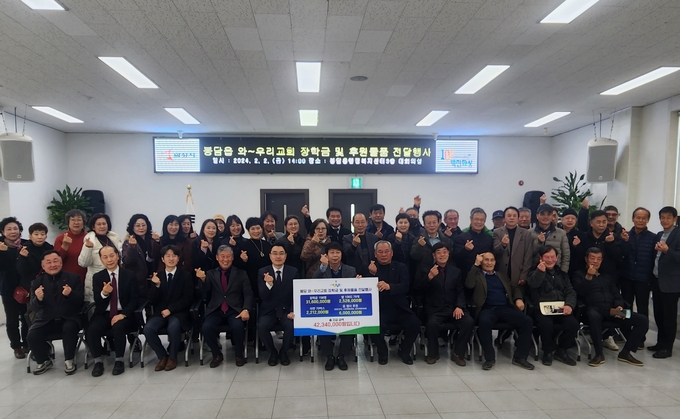 2024년 상반기 장학금 3160만원을 150명에게 전달하는 등 지난 2월의 장학금 및 후원물품 전달 행사 후 관계자들이 기념사진을 찍고 있다.