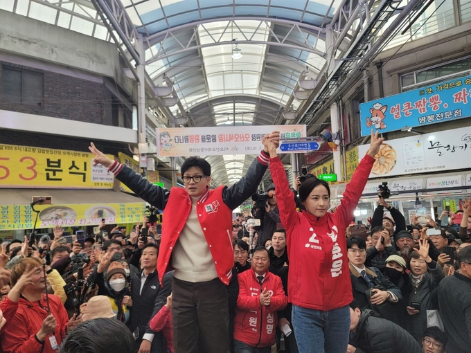 김효은 후보는 국민의힘 중앙선거대책위원회 위원으로 활동 중이다. 사진은 지난 16일 후보 지지를 위해 오색시장상인회를 방문한 한동훈 위원장과 함께한 김효은 후보.