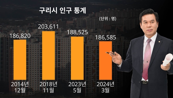 김 후보는 IT분야 경제전문가로서 현재 구리시는 다른 인접도시에 비해 사실상 역성장을 하고 있다고 밝혔다. 이유는 인구감소 현상을 예로 들었다. 통계에 따르면 구리시는 2014년 12월 186, 820명이었던 인구가 4년만인 2018년 11월 203, 611명으로 16,700명 가량이 늘어나 처음으로 20만 도시로 진입했다. 그러다 2024년 3월 재조사에서는 오히려 10년 전인 2014년과 비슷한 186,585명으로 감소한 것으로 나타났다.