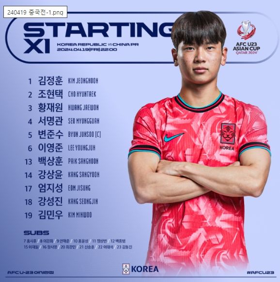황 감독은 지난 경기와 비교해 3명이 달라진 선발 라인업을 내세웠다. 먼저 최전방 공격수는 1차전 선발이었던 안재준(부천FC) 대신 교체로 나서 결승골을 기록했던 이영준이 맡게 됐다. 2선에는 엄지성(광주FC), 강상윤(수원FC), 강성진(FC서울)이 포진했다. 2선은 지난 경기와 비교하면 홍시후(인천유나이티드)가 빠지고, 강성전이 들어갔다.