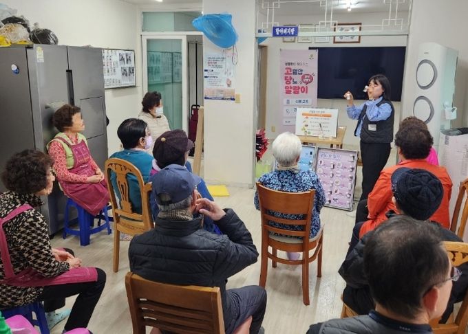‘고당 알람이 교육’은 어르신들의 자가 건강관리 능력 향상을 위해 마련된 프로그램으로, 평소 보건소 방문이 어려운 어르신들을 대상으로 주 1회 직접 경로당을 방문하여 고혈압과 당뇨에 대한 교육을 진행한다.