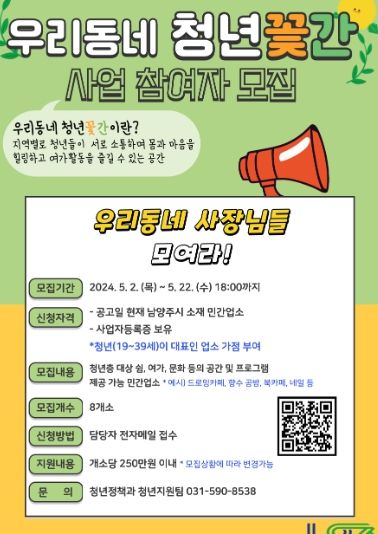 신청 자격은 남양주시 소재 사업자로 민간 유휴공간을 보유하고 있고, 청년(19세~39세) 대상 프로그램을 운영할 계획(5회 이상)이 있는 사업자여야 한다.
