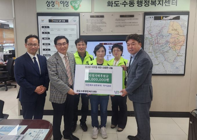 (정도일보) 남양주시 화도읍에 소재한 대한예수교장로회 마석교회(담임목사 곽병태)는 지난 2일 지역 내 취약계층 위해 후원금 5,000,000원을 화도읍 지역사회보장협의체(민간위원장 황정순, 공공위원장 박재영)에 전달했다.