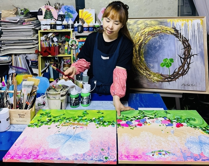 김민숙 화가는 "네잎 클로버는 행운, 세잎 클로버는 행복이라는 의미를 갖고 있는데... 가족, 친지, 지인 등 이웃들과 아름다운 교제와 나눔을 가지며 사는 것 그 자체가 행운이며 행복이라는 사실을 전하고 싶었다"고 말하고 있다/김현섭 기자