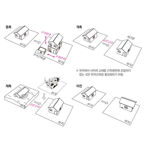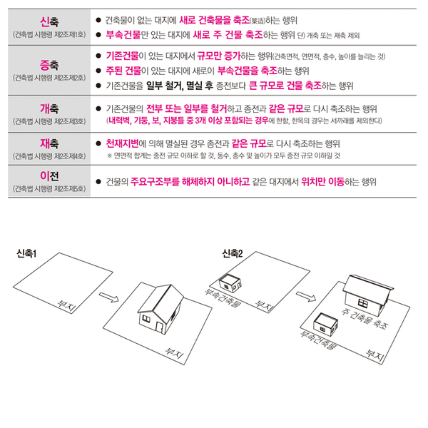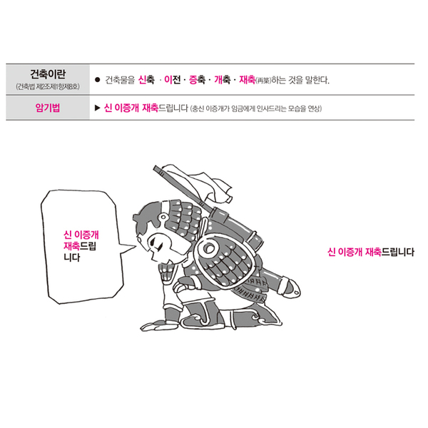 건축이란 신축 또는 이전, 증축, 개축, 재축하는 것을 말하는데, 앞 글씨만 이용하여 “신 이증개 재축 드립니다”라고 외우면 건축행위에 대해 바로 외울 수 있다. 또한, 신축, 증축, 이전은 대체로 잘 알고 있지만, 개축과 재축은 약간 헷갈리는 개념이다.