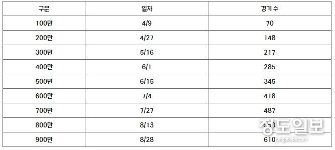 2024 시즌 100만 단위 달성 일자 및 경기 수