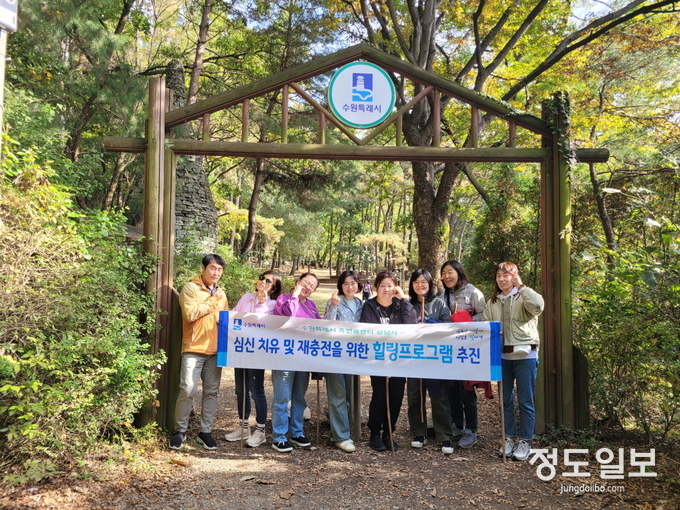 [정도일보 고정희 기자] 수원시(시장 이재준)가 휴먼콜센터 상담사들의 마음을 치유하고, 사기를 진작하기 위해 ‘광교산 산림치유 프로그램’을 운영했다.