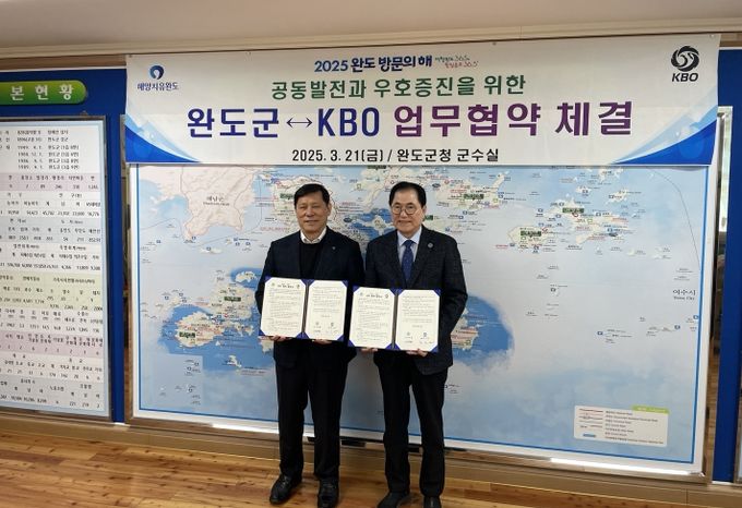 (정도일보) KBO(총재 허구연)와 완도군은 3월 21일 국내 프로, 아마추어 야구팀들의 동계전지훈련 및 대회, 야구관련 행사 등 야구 발전과 지역경제활성화를 위한 ‘남해안벨트 MOU’를 체결했다.