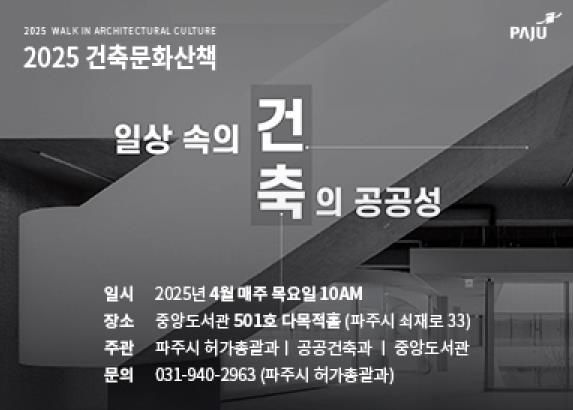 (정도일보) 파주시는 4월 한 달간 매주 목요일 오전 10시부터 12시까지 ‘2025 건축문화산책’ 강연을 개최한다.