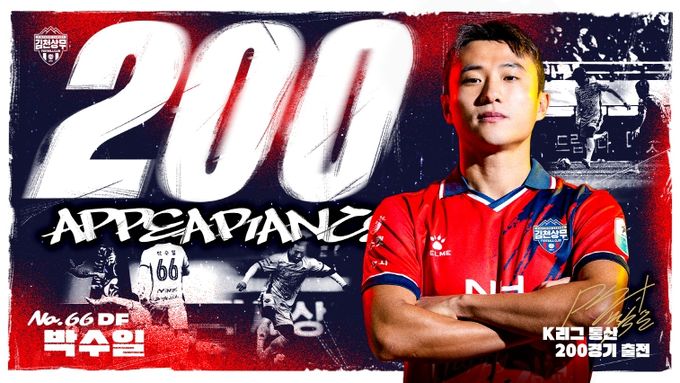 김천상무프로축구단(대표이사 이재하, 국군체육부대장 진규상)의 박수일이 ‘하나은행 K리그1 2025’ 5R에 출전하며 K리그 통산 200경기에 출전을 달성했다. 박수일은 “입단한 지 얼마 지나지 않은 것 같은데, 벌써 200경기라고 생각하니 시간이 참 빠른 것 같다. 앞으로도 더 많은 경기에 나설 수 있도록 최선을 다하겠다.”라고 소감을 말했다.