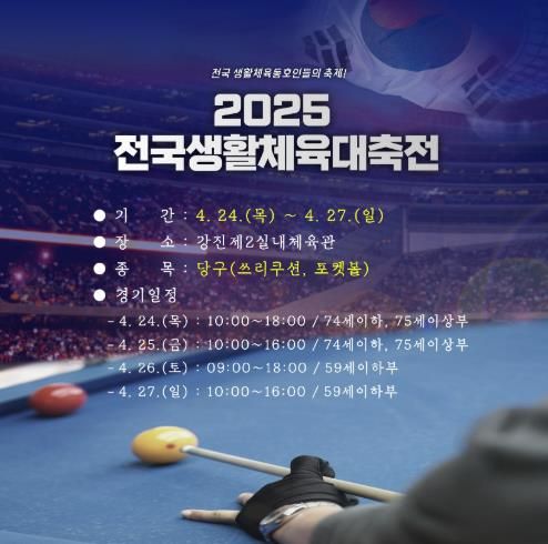 (정도일보) 전국 생활체육인들의 축제인 2025 전국생활체육대축전이 오는 4월 24일부터 4월 27일까지 전남도 20개 시군, 57개 경기장에서 총 41개 종목이 개최된다.