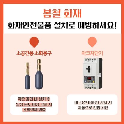 (정도일보) 가평소방서는 봄철 건조한 날씨로 인한 화재 위험이 높아지는 가운데, 도내 가정과 소규모 시설을 중심으로 전기화재를 예방하기 위한 ‘소공간용 소화용구’와 ‘아크차단기’ 설치를 적극 권장한다고 8일 밝혔다.