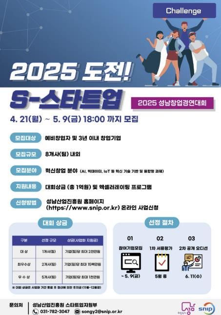 (정도일보) 성남산업진흥원은 유망 창업 아이템을 발굴하고 지역 창업 생태계 활성화를 위한 ‘2025 성남 창업경연대회(도전! S-스타트업)’를 개최하며, 오는 5월 9일까지 참가 기업을 모집한다고 밝혔다.