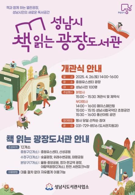 성남시는 12곳 책 읽는 광장 도서관을 대표해 중원유스센터 광장(하대원동)에서 이날(4.26) 오후 2시 개관식을 연다.