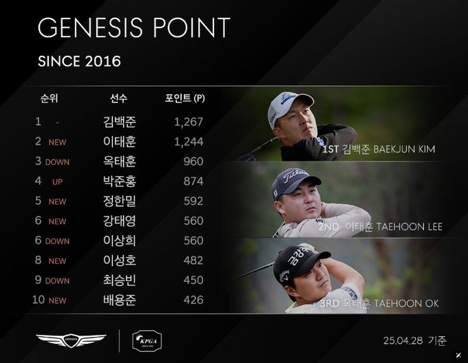 개막전 ‘제20회 DB손해보험 프로미 오픈’에서 생애 첫 우승을 달성하며 제네시스 포인트 1위에 올랐던 김백준은 ‘우리금융 챔피언십’에서 공동 10위에 오르며 제네시스 포인트 266.50포인트를 얻어 총 1,266.50포인트로 2개 대회 연속 제네시스 포인트 1위를 유지했다.
