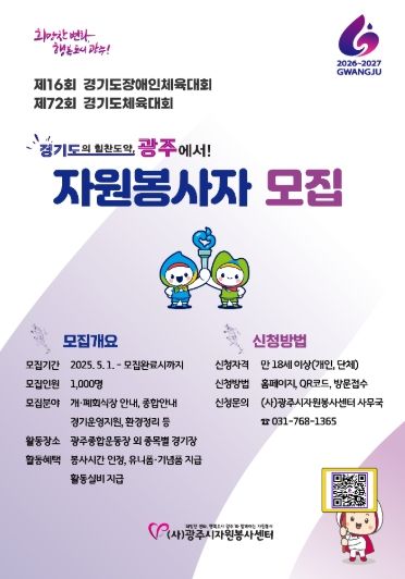 이번 체육대회는 2026년 4월 말부터 5월 초까지 광주시 전역에서 개최되며 자원봉사자는 △종목별 경기장 운영 지원 △개폐회식 지원 △종합상황실 운영 △주차 및 교통 안내 등 다양한 분야에 투입돼 대회의 원활한 진행을 지원할 예정이다.