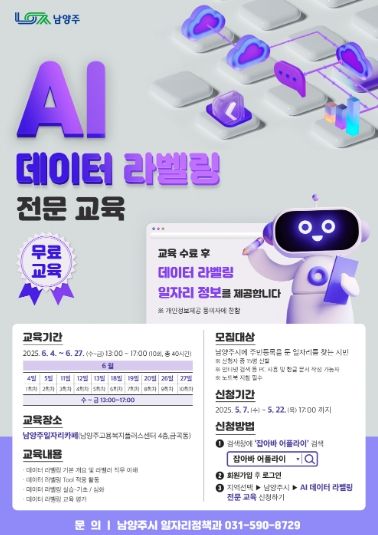 (정도일보) 남양주시는 오는 7일부터, 시민들의 디지털 산업 분야로의 취업 성공을 지원하기 위해 ‘AI 데이터 라벨링 전문 교육’을 모집한다고 2일 밝혔다.