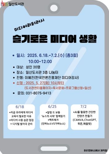 (정도일보) 고양특례시 일산도서관은 오는 6월 18일부터 7월2일까지 매주 수요일 총 3회에 걸쳐 성인 20명을 대상으로 ‘슬기로운 미디어 생활’ 프로그램을 운영한다.