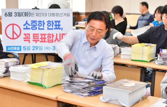(정도일보) 장성군이 18일 장성읍, 삼서·북하면 행정복지센터에서 제21대 대통령선거 후보별 공약이 담긴 책자형 공보물의 우편발송 준비를 시작했다. 다른 지역은 19일부터 준비 작업에 들어간다. 투표안내문이 포함된 전단형 선거공보는 22~23일에 작업해 발송할 예정이다.
