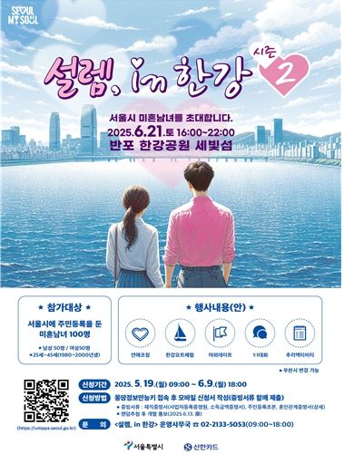 모집대상은 서울시 거주 25~45세 미혼남녀(2000년생~1980년생) 총 100명(남50, 여50)으로 참가신청은 5월 19일 오전 9시부터 6월 9일(월) 오후 6시까지 몽땅정보 만능키에서 신청하면 된다.