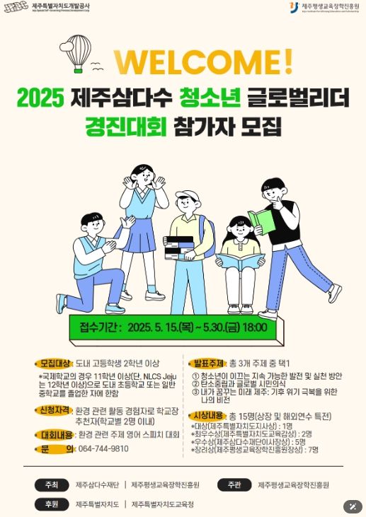 (정도일보) 제주삼다수재단(이사장 백경훈)과 제주평생교육장학진흥원(원장 진희종)은 국제적 감각을 지닌 글로벌 리더 양성을 위한 ‘2025 제주삼다수 청소년 글로벌리더 경진대회’를 개최함에 따라 참가자를 오는 30일까지 모집한다고 밝혔다.