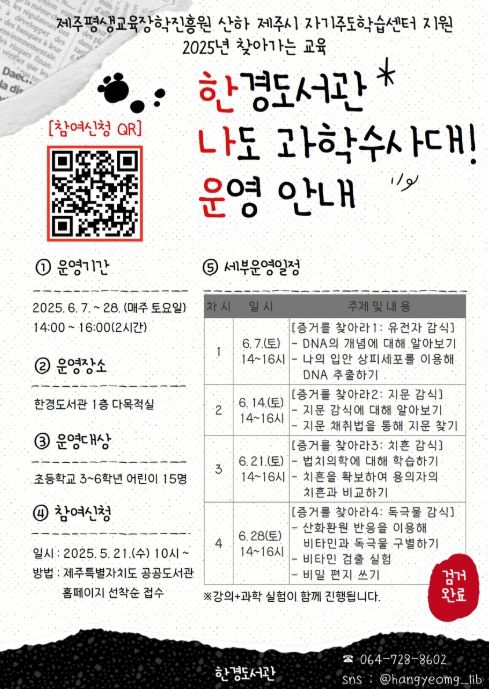 (정도일보) 제주시 한경도서관은 6월 한 달간 도서관 다목적실에서 ‘나도 과학수사대!’ 프로그램을 운영한다.