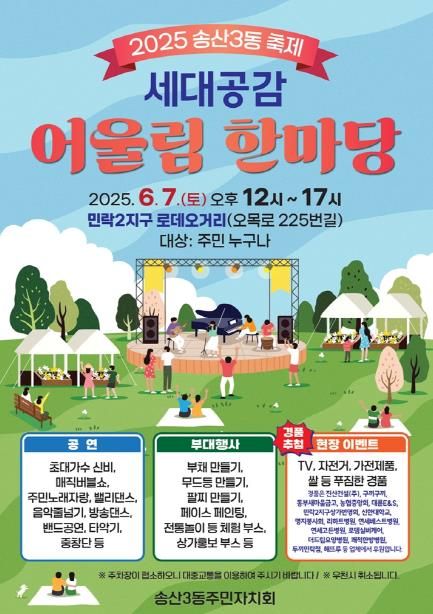 (정도일보) 의정부시 송산3동행정복지센터는 6월 7일 주말 송산3동 주민자치회가 민락2지구 로데오거리에서 ‘송산3동 세대공감 어울림 한마당 축제’를 개최한다고 밝혔다.