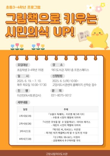 (정도일보) 고양특례시 덕이도서관은 오는 6월 19일부터 7월 10일까지 매주 목요일, 초등학교 3‧4학년을 대상으로 독서토론 프로그램‘그림책으로 키우는 시민의식 UP!’을 운영한다.