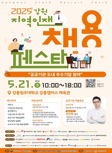 (정도일보) 강원특별자치도와 국토교통부는 도내 청년 인재들의 취업 기회 확대와 지역 내 일자리 매칭 강화를 위해, 5월 21일 강릉원주대학교 강릉캠퍼스 체육관에서 『2025 강원 지역인재 채용페스타』를 개최한다고 밝혔다.