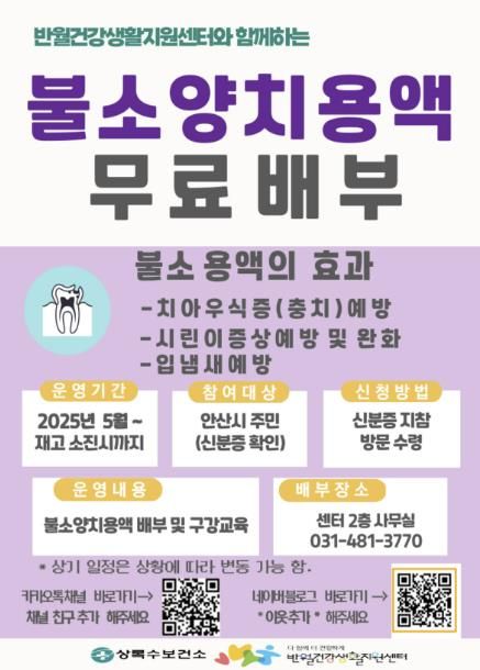 (정도일보) 안산시 반월건강생활지원센터는 시민의 구강건강을 위해 ‘불소양치용액 무료배부 사업’을 진행한다고 20일 밝혔다.