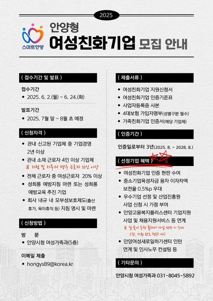 [정도일보 김선자 기자] 경기도 안양시는 '안양형 여성친화기업' 인증 및 선정을 위해 오는 24일까지 참여 기업의 신청을 받는다고 지난 2일 밝혔다.