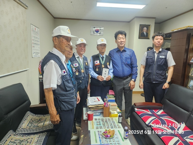 지난 19일 대한민국 6.25참전유공자회 수원시지회 사무실에서 장경민 한전MCS(주) 서수원지점정이 이구정 지회장에게 후원금을 전달하고 기념 사진을 찍고 있다.