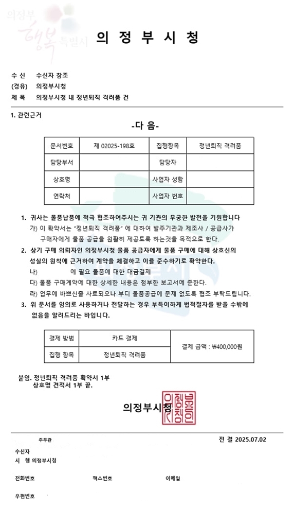 공무원 사칭 범죄자가 업체에 보낸 '위조 공문' 양식. [사진=의정부시]