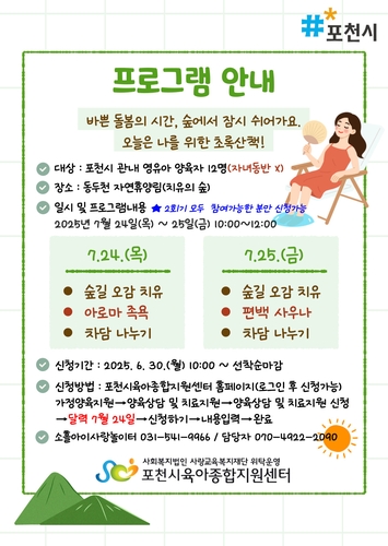 [정도일보 김현섭 기자] 포천시육아종합지원센터는 오는 24~25일 이틀간 자연휴양림(치유의 숲)에서 영유아 양육자를 위한 힐링 프로그램 '함께, 숲마실 - 나를 위한 초록산책'을 운영한다.