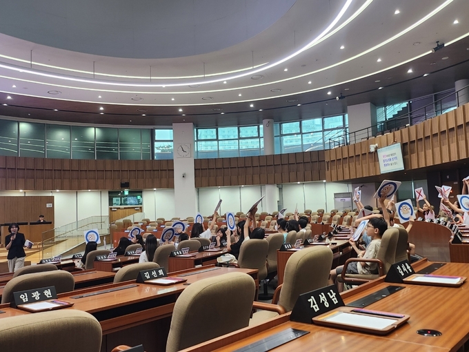 이날 경기도 의회에 도착한 자치회 학생들은 각자 마련된 자리에 앉아서 경기도의회의 역할과 기능에 대해 들었다. 이어서 전교 임원단의 진행으로 모의의회를 실시했다.
