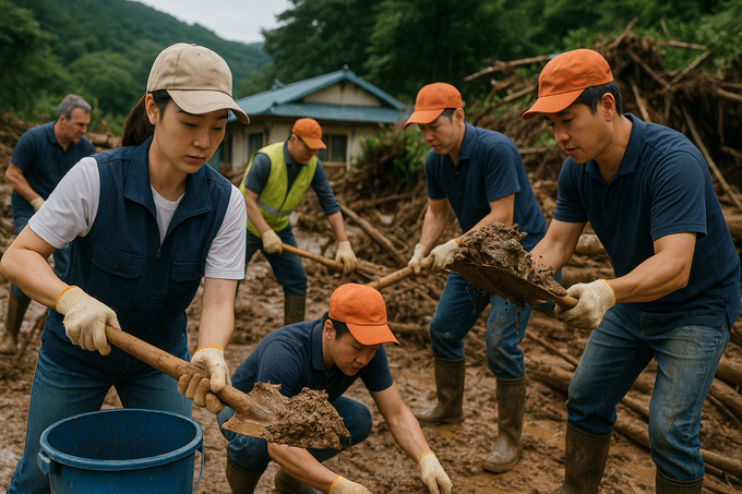 수해피해 복구를 위해 봉사활동을 하고 있는 자원봉사자들 DALL·E 이미지@김한준
