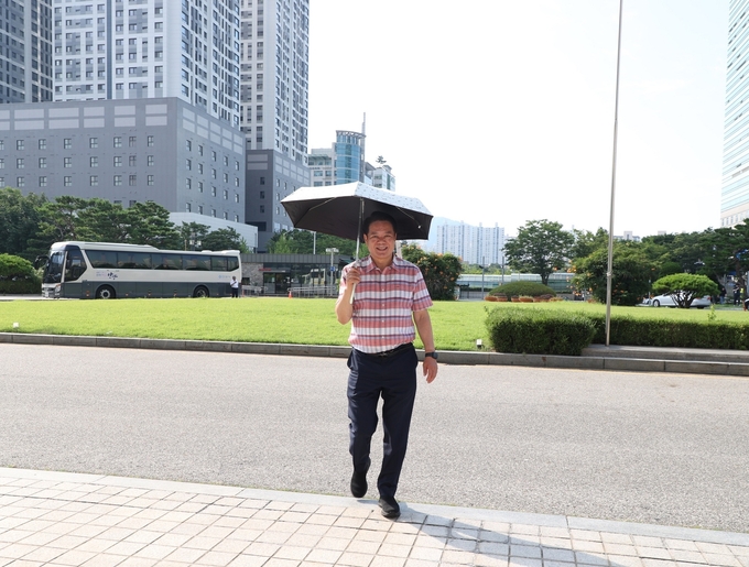 안양시 '쿨맵시 데이'인 1일 양산을 쓴채 가벼운 복장으로 출근하는 최대호 안양시장. [사진=안양시]