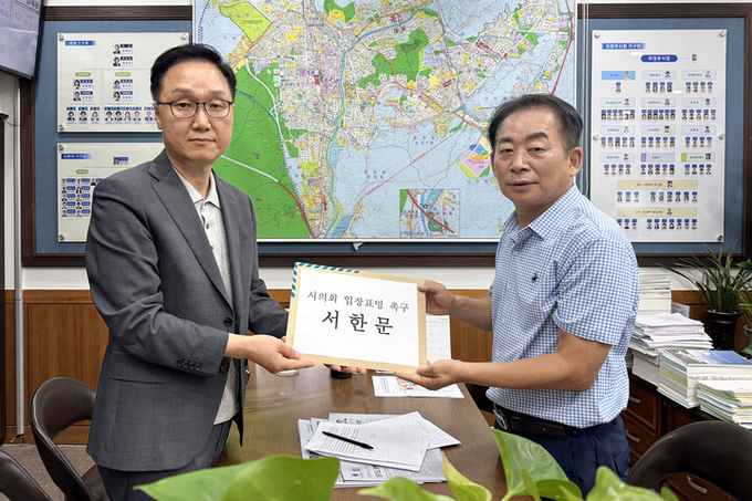 강현석 의정부시 부시장(왼쪽)이 18일 의정부시의회를 방문해 김연균 시의장에게 시 재정운영 왜곡 논란에 대한 책임있는 입장 표명을 촉구하는 서한문을 전달하고 있다 [사진=의정부시]
