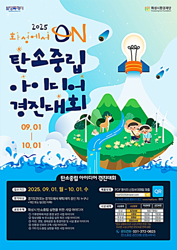 [정도일보 김현섭 기자] 화성시환경재단이 시민의 탄소중립 정책사업 참여와 탄소중립 실현에 대한 관심도 제고를 위한 ‘2025 화성에서 ON: 탄소중립 아이디어 경진대회’를 개최한다고 4일 밝혔다.