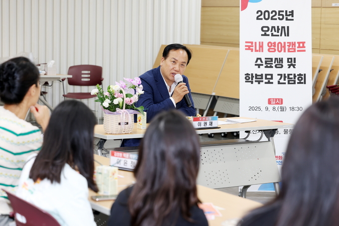 이권재 오산시장(가운데이 2025년 오산시 국내 영어캠프 수료생 및 학부모간담회 발언을 하고 있다. [사진 = 오산시]