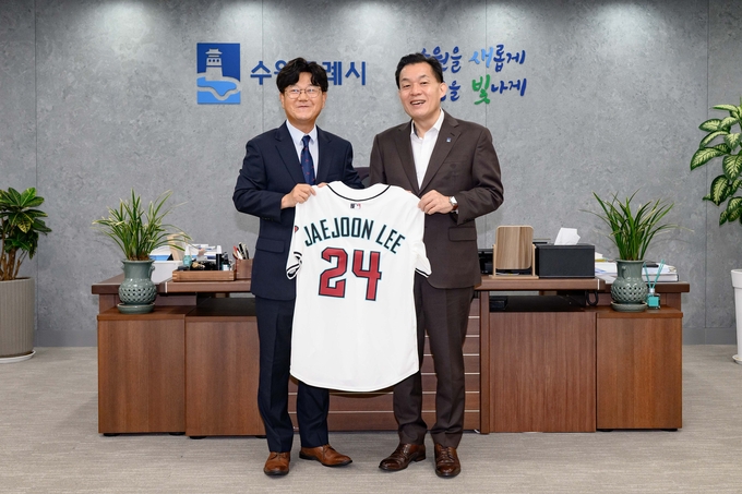 임애훈 아리조나한인회장이 이재준 시장의 이름이 새겨진 애리조나 다이아몬드백스(메이저리그) 유니폼을 전달하고 있다.